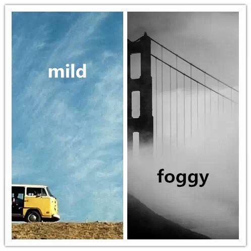 | mild - 温和的;轻微的;淡味的;文雅的;不含有害物质的的 | foggy - 有雾的;模糊的,朦胧的 |