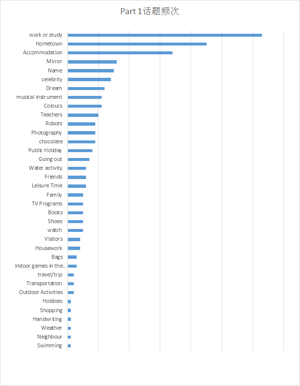 ➀ Part 1除了基础的寒暄类话题:name、hometown、work or study和accommodation高居榜首外,mirror、dream、musical instrument、robots等新题被考到的比例是最高的,同学们应该着重准备。