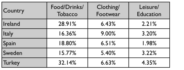 It can be seen that Sweden had the lowest percentages of national consumer expenditure for food/drinks/tobacco and for clothing/footwear, at nearly 16% and just over 5% respectively. Spain had slightly higher figures for these categories, but the lowest figure for leisure/education, at only 1.98%.