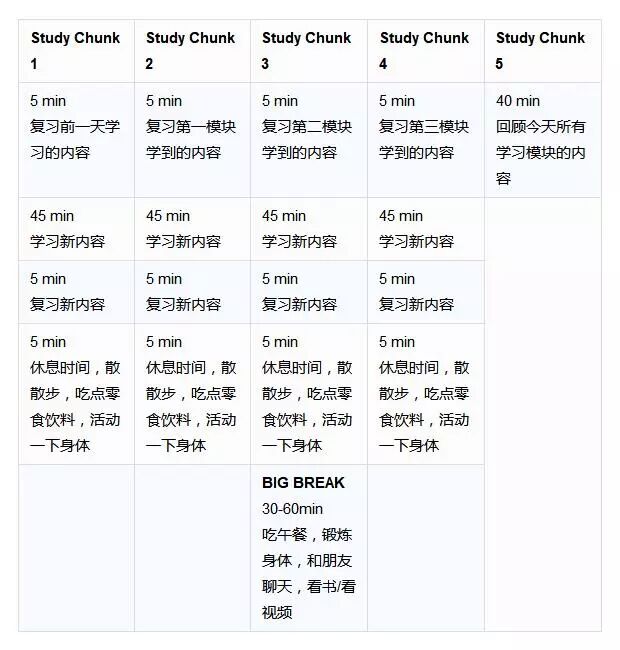 下面给大家整理了一份“模块学习法”具体的时间计划表,假设你一天要学习某科目5小时,我们可以划分这几个模块,使学习效率达到最优化。