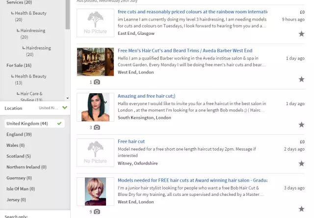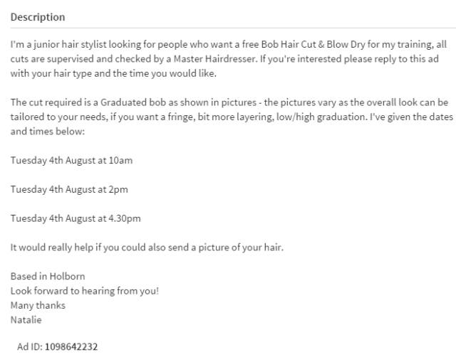 然后呢,这两个学校的学生经常会在网上找可以练手剪头发的人,比如这一阵子特别流行的lob头,学校估计会来个lob头考试,所以他们会在网上发布可以免费剪头发的信息。