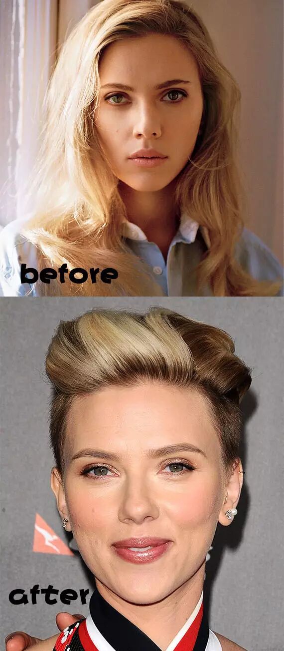 寡姐Scarlett Johansson作为性感尤物,冒险走了短发路线还算硬朗帅气。