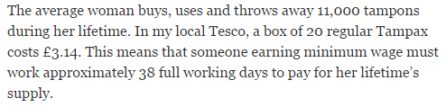 于是。。。这么呵呵哒的政策自然是让广大少女熟女妇女大妈们义愤填膺啊,他们纷纷上街抗议:每盒姨妈条儿(tampons)只有20个都还要3.14胖子,我们每个姑凉要用差不多11000个姨妈条儿才能勉强过好这一生,我得至少工作整整38天才能付掉这笔巨款好吗?(嗯,Vicky帮忙算了下:3.14X(11000/20)=1727胖子)