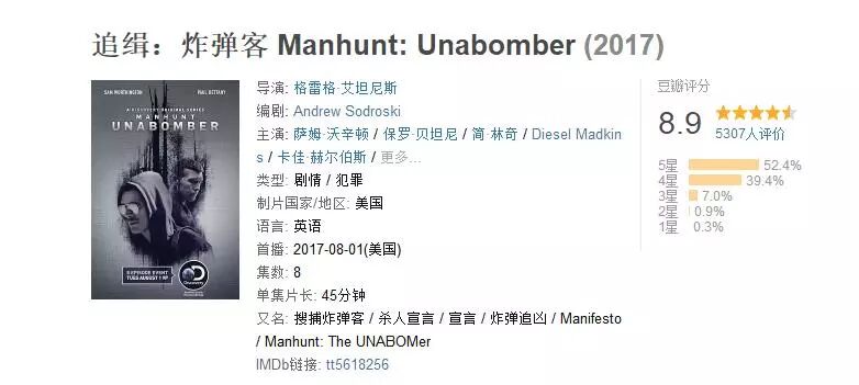 该剧根据真实故事改编,大学炸弹客Ted Kaczynski是位大学数学教授,拥有167的高智商,以炸弹犯罪引致3死23伤。