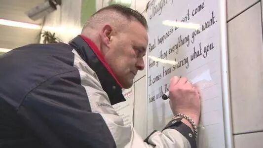 于是,他决定为地铁站每日行色匆匆的乘客们写一句鼓舞人心的智慧名言。