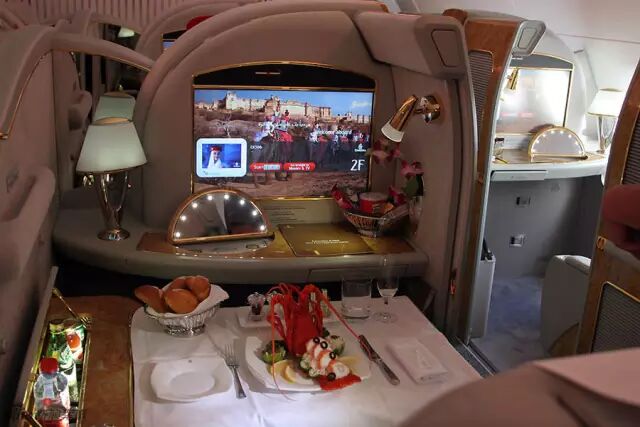 阿联酋航空公司给头等舱的乘客提供了私密套房,配有一个滑门、迷你酒吧、镜子和衣橱,还有23英寸的电视机和随叫随到的饮食服务,这也许会让你忘记自己在飞机上。 同样在阿联酋A380的上甲板有两个浴室可供头等舱的乘客洗澡。