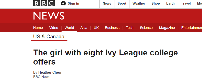 2017年4月12日,据BBC News报道,凭借一篇充满真情实感的作文,出生于马来西亚的17岁美国华裔女孩萧靖彤(Cassandra Hsiao)被全部八所常春藤盟校录取,成为华人世界的热门话题。