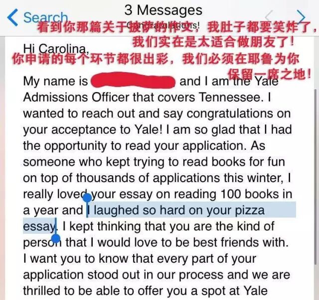 并且,耶鲁的招生人员也是披萨控,找到了知己的他很激动,专门给Carolina发信息祝贺: