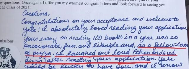 真的是爱吃披萨这么简单就会被耶鲁录取? Too young, too simple !在收到耶鲁寄回来的录取通知书的同时,负责招生的老师还特地附带了一封亲笔信: