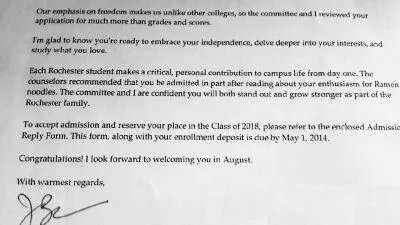 罗切斯特大学特意在他的录取通知书上面表达了对他泡面爱好的欣赏: