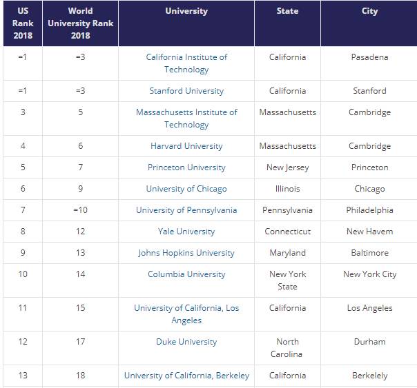 美国大学排名整体下滑,在美并列排名第一的加州理工和斯坦福大学,名次均降到了世界第三,麻省理工、哈佛与普林斯顿世界排名分别为第5、第6与第7。
