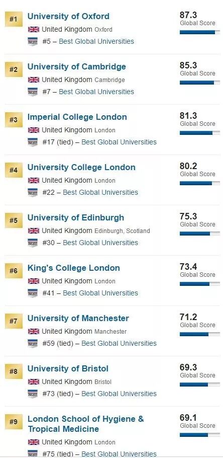 英国:只有10 所大学进入Top100;牛津大学世界排名第5,依旧领跑英国第一,剑桥世界排名第7,英国排名第2。