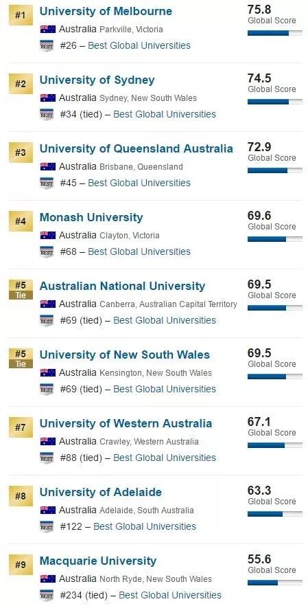 澳洲:相较于去年,今年所有澳洲大学在世界上的排名呈现上升趋势。墨大世界排名26位,稳居澳洲第一,成为唯一进入全球前30的澳洲大学!而其他的澳洲八大仍位于全球前列!