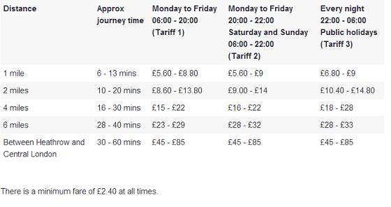 出租车收费请看下图,三个字形容就是: 贵贵贵!嗯……起步价最低有£2.40,15分钟车程至少10镑吧~
