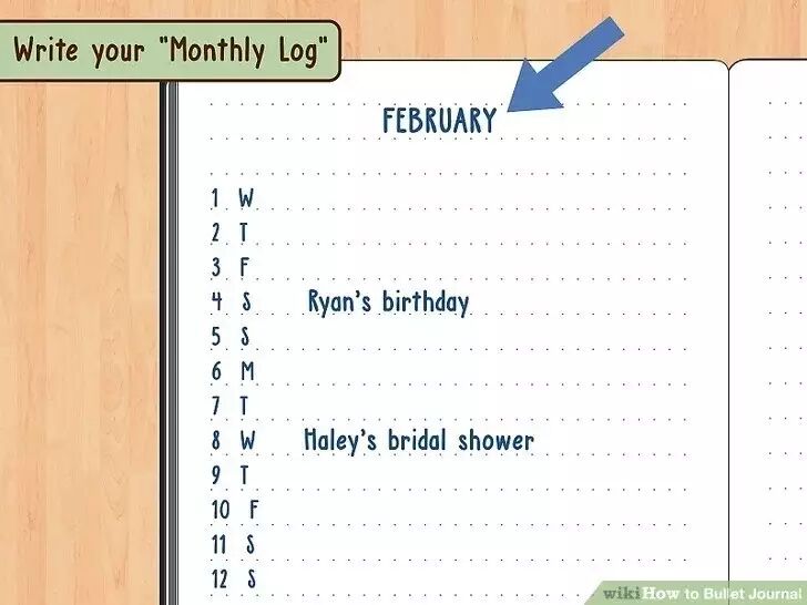 翻到下一个空白页开始制定月度日志,目的是对整个月的安排有一个概览。从当前月份开始记录,将月份名称写在左右两页面上方。