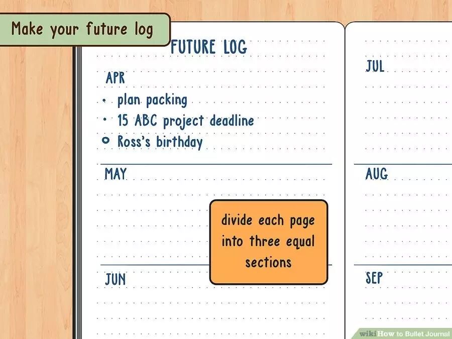 翻到下一个空白页面来设置未来日志,即对未来6个月需要完成的任务进行安排。先将Future Log作为这两页的标题写在上方,查一下本页的行数,划分为3部分。