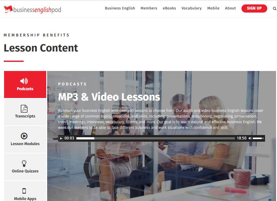 该播客系列适合商务英语学习者,内容主要为商业情景会话。每一节课先是由主持人针对特定话题进行阐述,接着就是对话内容了。每一节课会有对话文本、测试题以及词汇讲解。