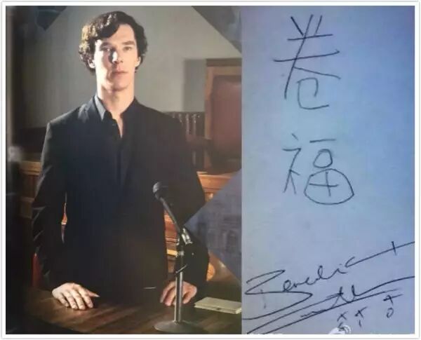 更是将自己最为人所知的“卷福”用圆体歪歪斜斜地写了出来↓