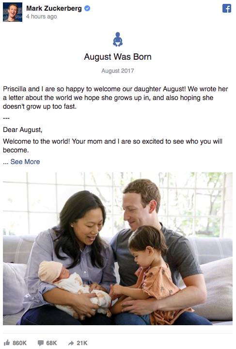 本周,脸书(Facebook)创始人马克·扎克伯格(Mark Zuckerberg)和妻子普莉希拉·陈(Priscilla Chan)迎来了第二个小公主的诞生,这位小公主名叫August(八月)。